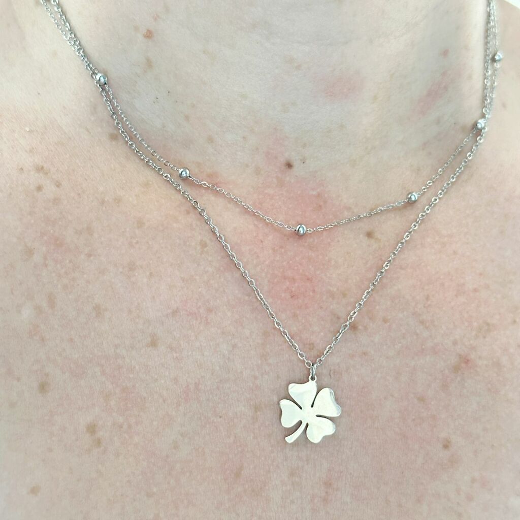 O design duplo, composto por duas correntes - uma com bolinhas e outra com o trevo da sorte - cria uma composição visualmente interessante. As bolinhas acrescentam um toque de delicadeza e feminilidade, enquanto o trevo da sorte adiciona um elemento simbólico e um toque de positividade ao colar.