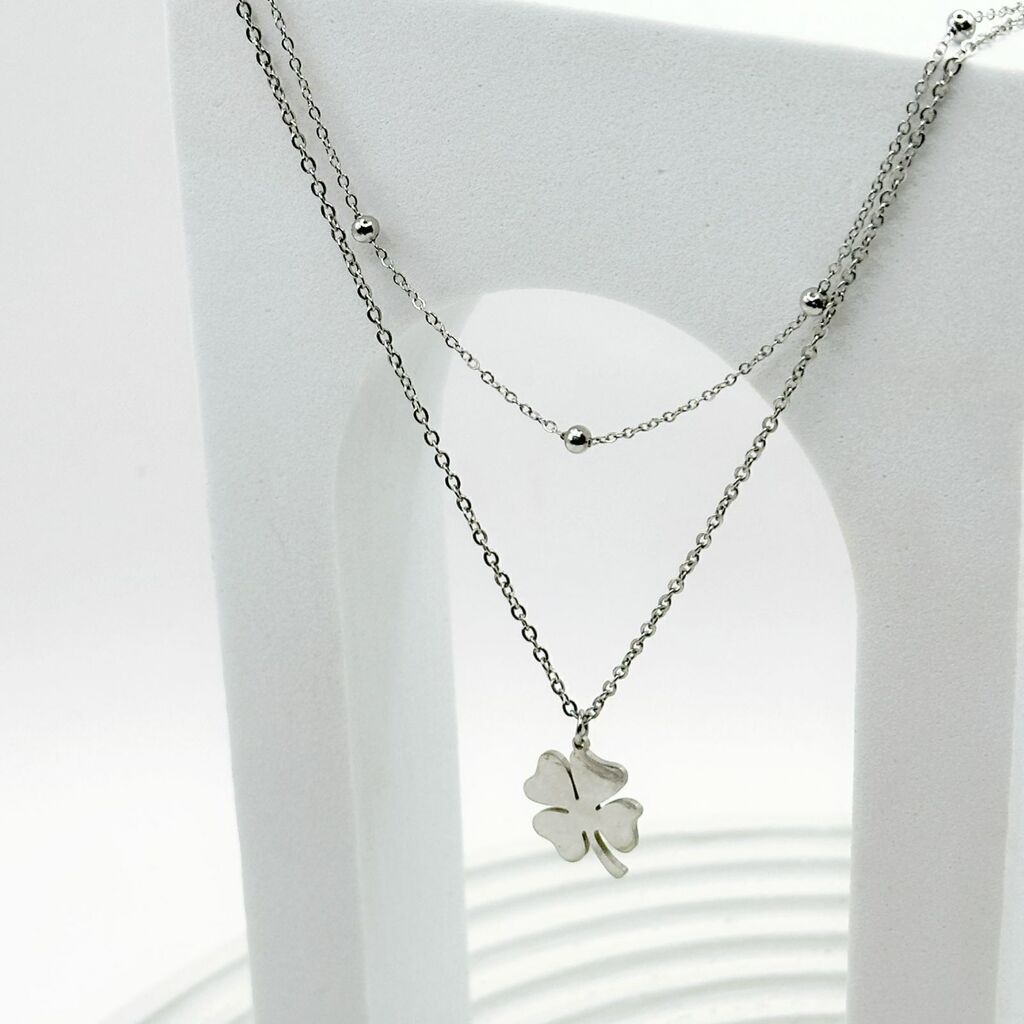 O colar duplo de bolinha e trevo da sorte em aço inoxidável é uma joia encantadora que combina elementos delicados com um toque de simbolismo. Este acessório oferece uma expressão moderna e elegante, unindo o charme das bolinhas e a boa fortuna associada ao trevo da sorte.